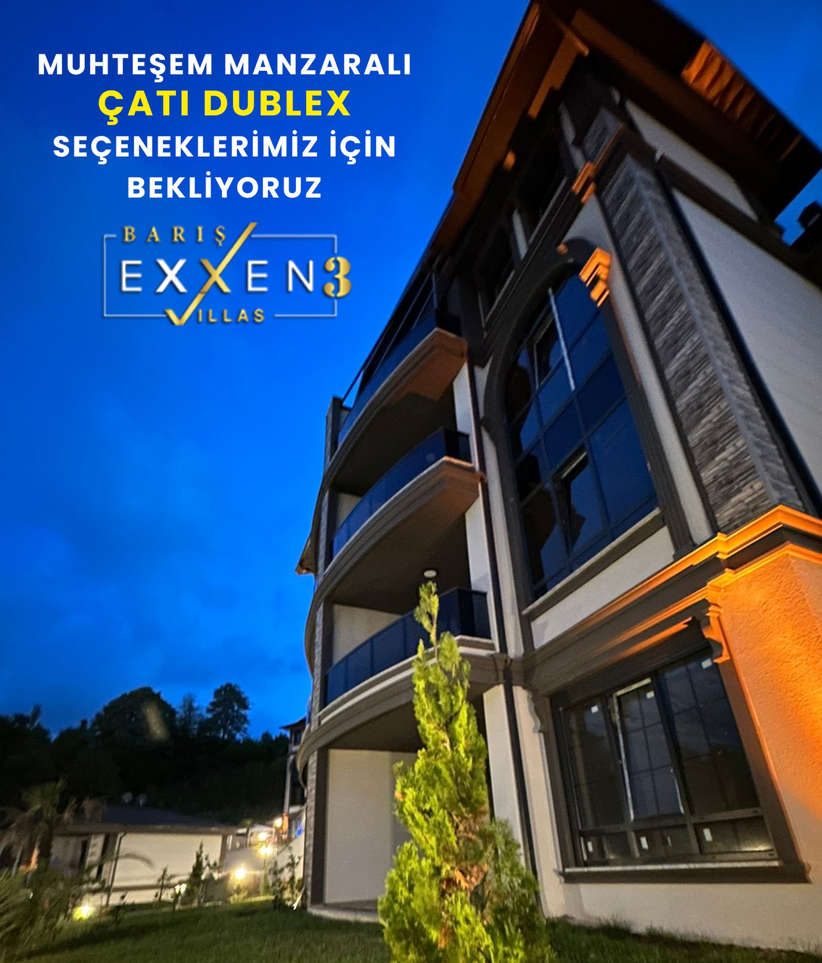 Exxen 3 Villaları 9.820 metre kare alan üzerine kurulu 15 adet özel tasarım villa , 6 adet bahçe dubleks ve 6 adet çatı dubleksten oluşmaktadır. Arkasında yemyeşil orman atmosferi ve ön cephesinde denizin huzur verici maviliklerine eşlik eden bir lokasyona sahip projemiz Barış İnşaat kalitesi ve güvencesiyle siz değerli müşterilerimizi bu muhteşem yaşam alanına davet ediyor.